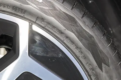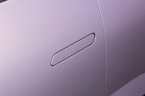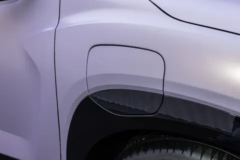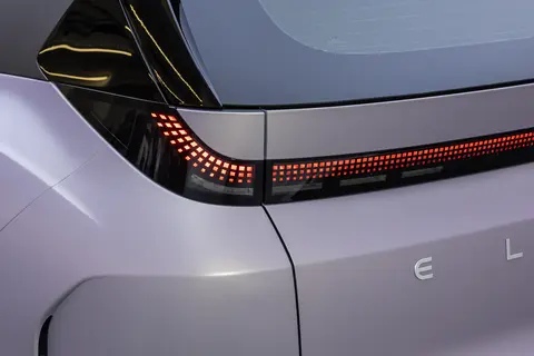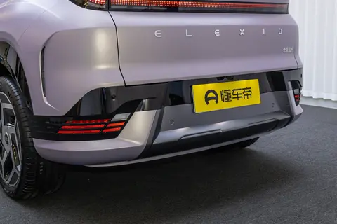 来到车身侧面,ELEXIO带有分段式腰线设计,车顶线条从B柱开始向下平滑过渡,与上扬式设计的车窗下沿相配合,营造出一种较为运动的车身姿态。黑化的车窗与车身形成双色效果,A柱大角度弯折与车顶过渡自然,笔直的车窗线条和倾斜的D柱饰板,进一步强化了这种运动感。前后轮上方向外隆起的翼子板,搭配亮黑的轮眉和运动轮毂,肌肉感十足。底部侧裙用黑色饰板覆盖,降低了车辆的厚重感。隐藏式门把手的设计,不仅降低了风阻,还让车侧看起来更加美观整洁。实拍车型配备的20英寸亮面轮辋,轮胎规格为255/45 R20,尺寸与造型都十分亮眼。此外,车辆还带有黑色外后视镜壳、黑色车顶行李架,充电口位于右前翼子板处,此前官方谍照中的车型还带有可开启全景天窗,这些细节都为车身侧面增添了不少魅力。