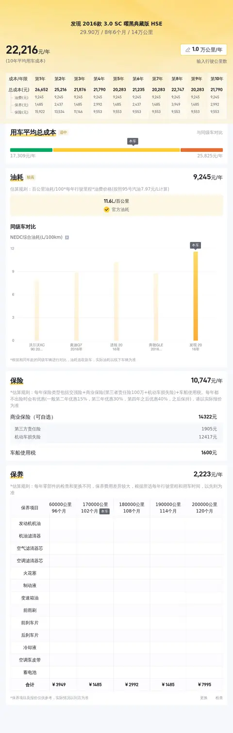 选择一辆车,不仅要喜欢它,更要考虑能否长期“供养”它。接下来,我们将一起评估与这辆二手路虎发现相关的年均使用成本,包括油费、保养费、保险费等各项支出。根据估算,该车的年均综合用车成本大约为每年2.2万元左右。具体费用(按每年 2 万公里计算)包括每年约1.9万元的油费、约7,000元的保险费和约1,000元的保养费。请留意,实际费用可能会因个人驾驶习惯、所在地区等因素而有所变动。