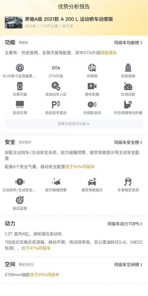 奔驰A级(图片|配置|询价)车系最早可追溯到1997年,当时梅赛德斯-奔驰推出了一款名为F200的紧凑型概念车,其采用独特的三明治底盘设计,将发动机和传动系统安装在一个夹层底盘中,为乘员提供更高的安全保护。首款量产版奔驰A级(W168)问世于1997年法兰克福车展,并于次年开始交付客户。作为一款五门掀背车,A级车拥有宽敞的空间和实用性,同时保留了奔驰品牌的豪华和品质标准。今天我们要看的这辆车是奔驰A级 2021款 A 200 L 运动轿车动感版,这辆车目前的二手车报价为12.2万元。