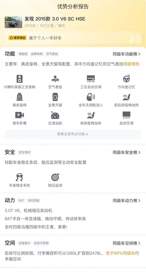 总的来说,路虎发现2015款3.0 V6 SC HSE是一款集豪华、性能和实用于一体的SUV。无论是对于追求驾驶乐趣的消费者还是对于注重舒适性和品质的消费者来说,它都是一个不错的选择。同时,随着二手车市场的发展和竞争的加剧,消费者也可以通过各种渠道了解到更多的车辆信息和价格情况,从而做出更加明智的购买决策。