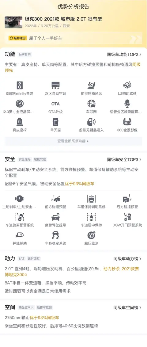综上所述的新车含税价、用车成本、市场行情、优势分析、同款比价等数据仅供参考。在配置部分,因为二手车非标品,车辆可能会存在配置改装的情况,具体车况信息需要线下结合车辆实际情况进行综合参考。