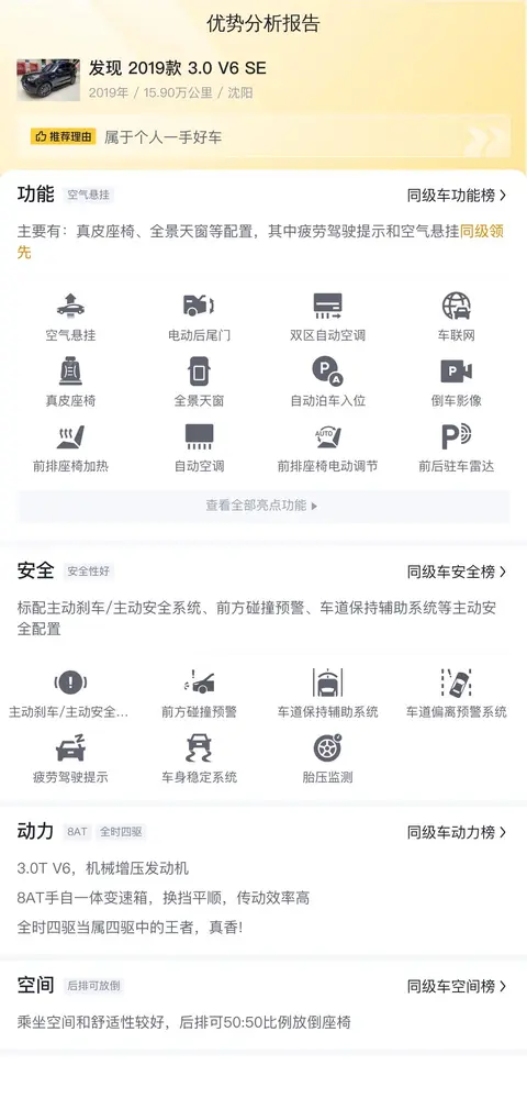 综上所述,发现 2019款 3.0 V6 SE凭借其豪华的内饰、出色的越野能力和强劲的动力表现,成为了一款集豪华与实用于一身的中大型SUV。无论是日常城市驾驶还是周末户外探险,它都能为驾驶者提供卓越的驾驶体验和舒适的乘坐感受。如果您正在寻找一款既能应对各种路况又能展现豪华风范的二手车,那么这款发现 2019款 3.0 V6 SE将是一个不错的选择。
