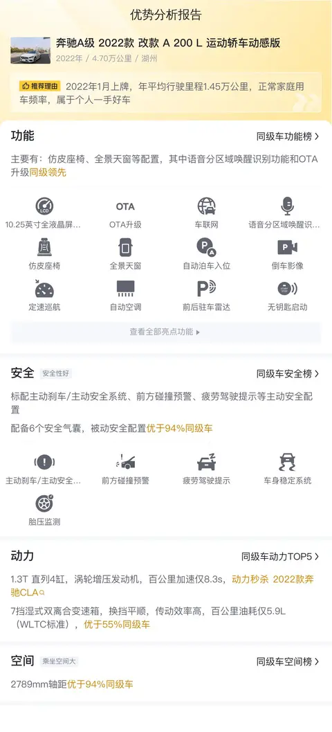 选购二手奔驰A级2022款改款A 200 L运动轿车动感版时,建议您重点关注车辆的实际情况,包括保养记录、事故排查等,确保所购车辆无重大隐患。同时,根据自己的预算和需求,理性购车,享受奔驰A级带来的精致驾乘体验。