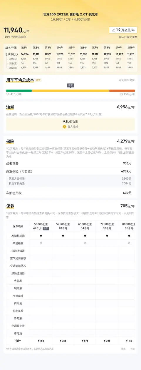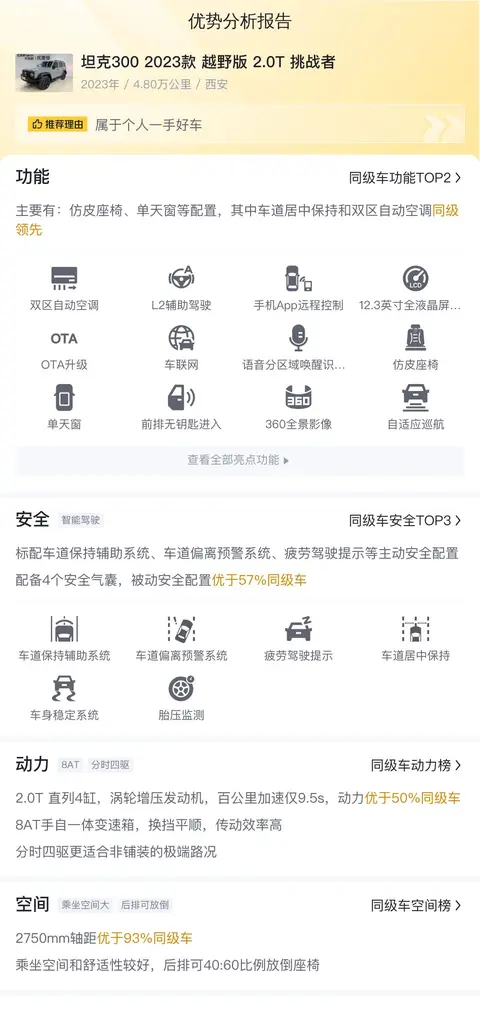 越野车之所以能让人着迷,是因为驾驶它总能激起你对征服险境的渴望。而谈及硬派越野,以往我们能选择的只有外国品牌高价车型。但长城汽车推出的坦克300(图片|配置|询价),它以亲民的价格提供了强悍的越野性能和舒适的驾乘体验,成功引领了国内硬派越野车的潮流。今天介绍的这辆坦克300 2023款 越野版 2.0T 挑战者,行驶了4.8万公里,是2023年的新车,报价16.98万,基本上跟新车一样了。