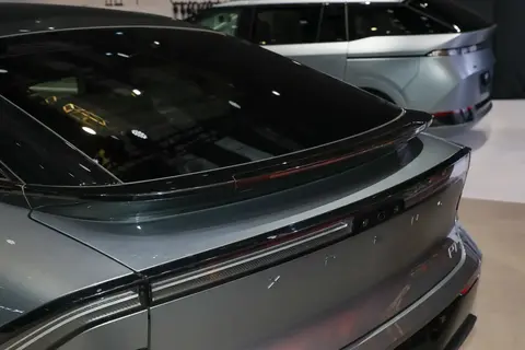 P7+的外观还是小鹏家族那套“星际设计”,分体式大灯+贯穿式灯带,白天看像眯着眼的“机械战警”,晚上点亮后辨识度直接拉满。溜背造型搭配0.206超低风阻系数,比Model 3还低0.004,高速上能省不少电。新增的星阙灰车漆有点东西,阳光底下看能泛出蓝紫色渐变,像开着一块会跑的星际陨石,车尾的主动升降尾翼(时速超110km/h自动升起)和扩散器设计,不仅好看,还能增加下压力,高速变道时方向盘手感明显更稳,不像某些轿跑“开快了发飘”。