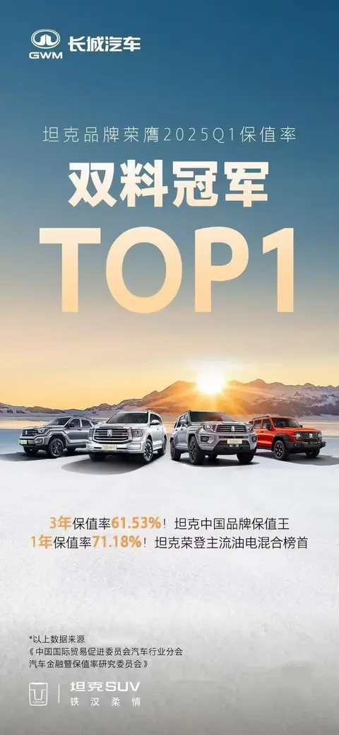 在近日由中国国际贸易促进委员会汽车分会和第一车网联合发布的《2025Q1中国汽车保值率排行榜》中,坦克品牌以卓越表现荣膺双料冠军,不仅以三年保值率61.53%的身份成为中国品牌保值王,还以1年保值率71.18%的成绩登顶主流油电混合榜首。这一荣誉标志着坦克品牌在中国汽车市场中的领先地位,更彰显了其强大的品牌价值和市场认可度。