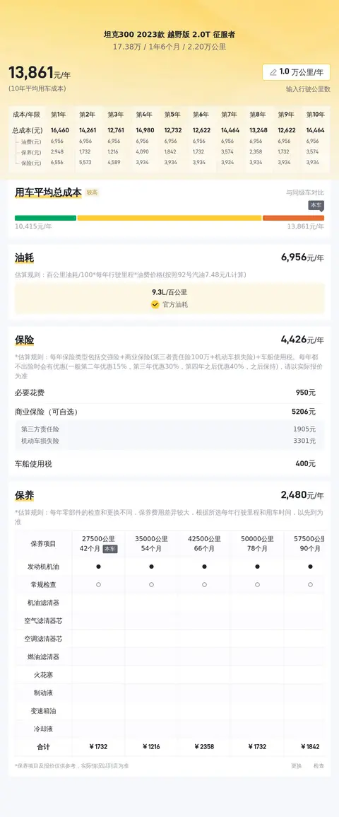 坦克300 2023款 越野版 2.0T 征服者的10年平均用车成本是13673元/年,也算是正常水准。