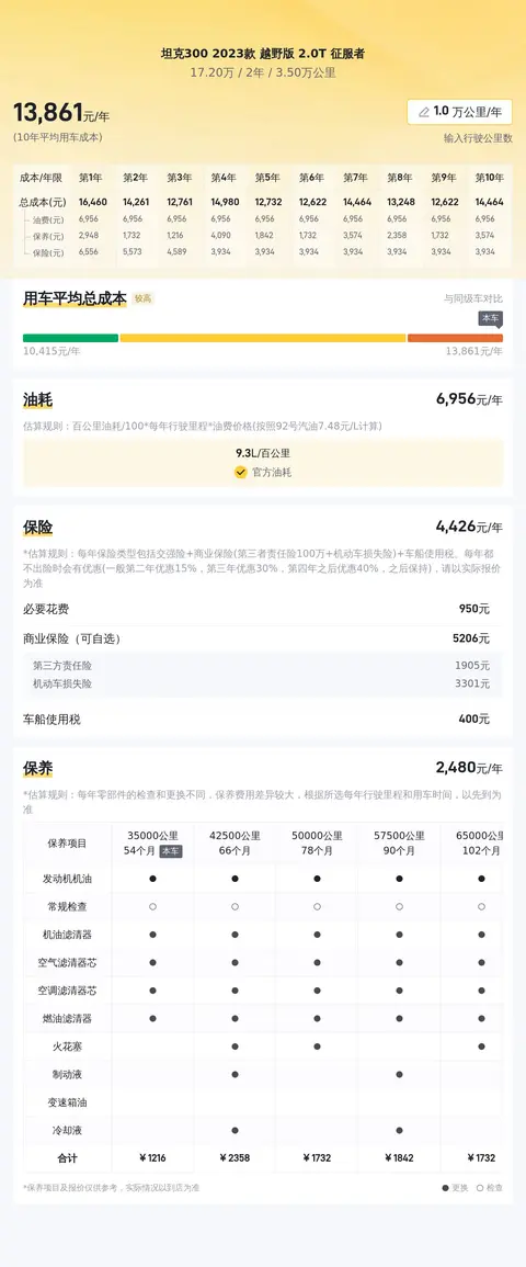 据估算,同级车的最低用车成本是13909元/年,最高是17666元/年,坦克300 2023款 越野版 2.0T 征服者是14461元/年,用车成本适中。