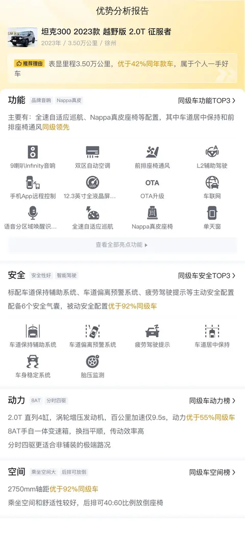 这辆坦克300 2023款 越野版 2.0T 征服者的优势是明显的,越野车需要的配置它都有,后桥差速锁,蠕行模式,坦克转弯,越野专用APP 这些配置让整车在极限环境下,也可以保证一定的舒适性, speakers Infinity音响,以及清晰度很高的AR-HUD,又给日常使用带来了不错的舒适性和科技感。