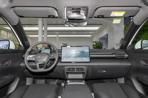 内饰部分,中控台整体造型很简洁,中控面板线条很平整,使用了悬浮式的仪表盘和中控屏,提供了DiLink100智能座舱、热泵空调以及远程车控等功能,高配车型还会有全景天窗。