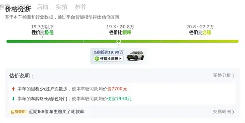价格背后藏着不少细节呢!首先,里程数是个关键点,毕竟少于均值1.9万公里,足足加价5500元呢!接着是车龄,它多于均值0.2年,这才合理减价1000元。再说说过户次数吧,少了均值0.7次,这可是加分项,加价2200元妥妥的!最后是颜色,这绿色个性十足,但价格嘛,得减去990元。把这些细节一一点缀进去,价格就显得更合理了。