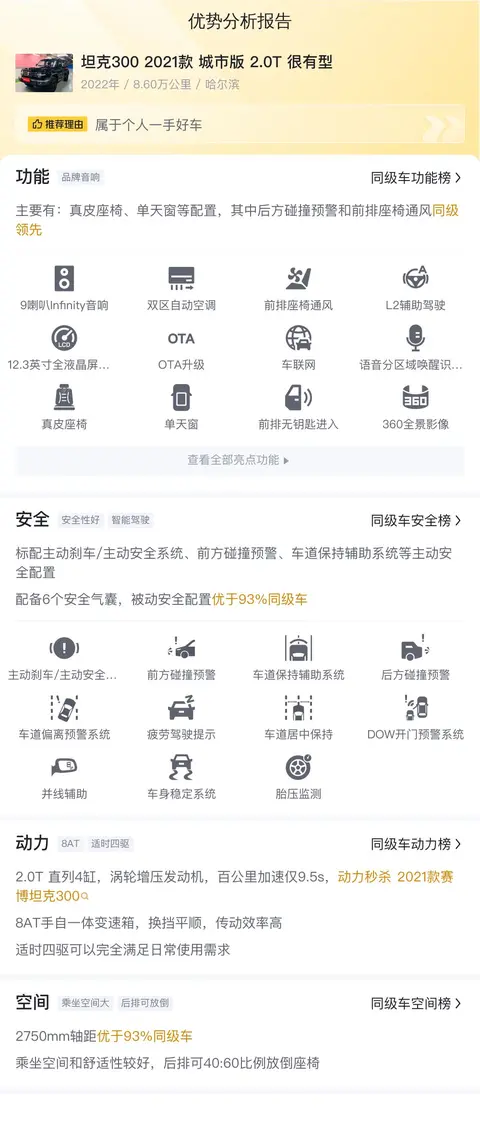 综合比较而言,在同级别车型中,坦克300城市版2.0T很有型在安全配置方面表现较为出色。其标配的主动刹车/主动安全系统、前方碰撞预警、车道保持辅助系统、车道偏离预警系统以及疲劳驾驶提示等主动安全配置,相较于其他车型来说,为驾驶者提供了更加全面的安全保障。同时,在舒适配置方面,坦克300城市版2.0T很有型同样表现出色。值得一提的是,同级领先的第二排电动调节座椅以及前排座椅通风功能,更是凸显了其在舒适性方面的优势。在被动安全配置方面,该车配备了6个安全气囊,为乘客提供了更加周全的保护。此外,车辆还配备了全速自适应巡航、Nappa真皮座椅等实用配置,进一步提升了驾驶的便捷性和乘坐的舒适性。所有数据来源于懂车帝数据库,仅供参考,车况信息需要线下结合车辆实际情况进行综合参考。