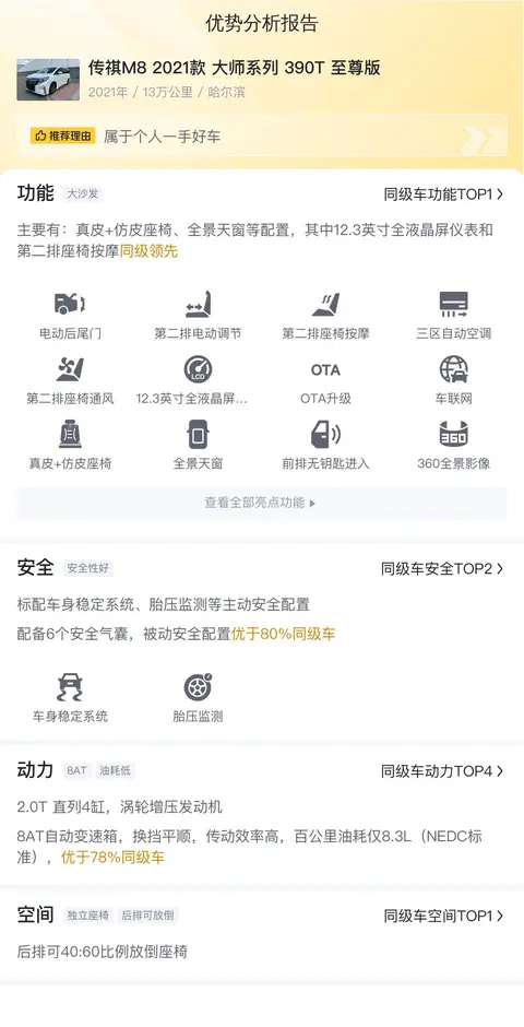综上所述的新车含税价、用车成本、市场行情、优势分析、同款比价等数据仅供参考。在配置部分,因为二手车非标品,车辆可能会存在配置改装的情况,具体车况信息需要线下结合车辆实际情况进行综合参考。