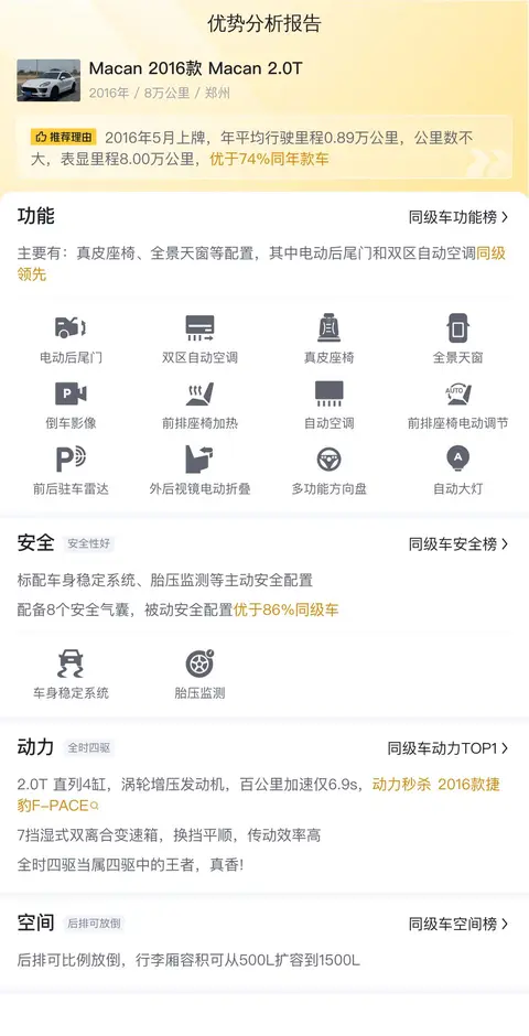 先让我们来了解一下这辆二手Macan的基本情况,该车的具体版本是——2016款 Macan 2.0T。该车已经行驶了8万公里,上牌时间为2016年5月,有过1次过户记录。车源地和上牌地均为郑州,车身颜色为白色。该车新车指导价为55.8万,目前二手车报价为13.98万。