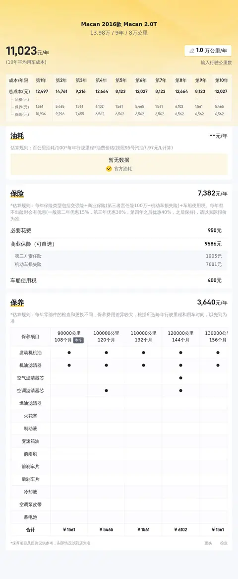 这辆车的预计十年平均用车成本为每年2.2万元左右,这项开支具体金额跟车主的用车习惯有直接关系。