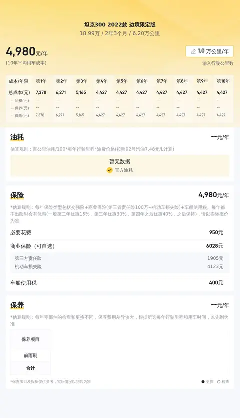 从用车成本角度来看,坦克300 2022款 边境限定版在油费、保养和保险费用等方面的表现均处于合理水平。虽然其官方百公里油耗为11.9L,但实际使用过程中,很多车主都能够通过良好的驾驶习惯和维护保养来降低油耗。此外,车辆的保养和保险费用也都在可接受范围内,不会给车主带来过大的经济负担。总体来说,坦克300 2022款 边境限定版是一款集个性、实用与性价比于一身的二手车选择。无论是对于追求个性和品质的年轻消费者,还是对于注重实用性和经济性的家庭用户来说,这款车都能够提供满意的表现。