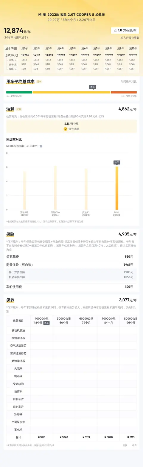 选择二手车,不仅要考虑买车成本,还要衡量一下用车成本,包括燃油费用、保险费用、保养费用等。根据我们对该车的综合分析,预估平均用车成本约为每年1.3万元左右。当然具体金额还是要以车辆的实际使用情况为准。