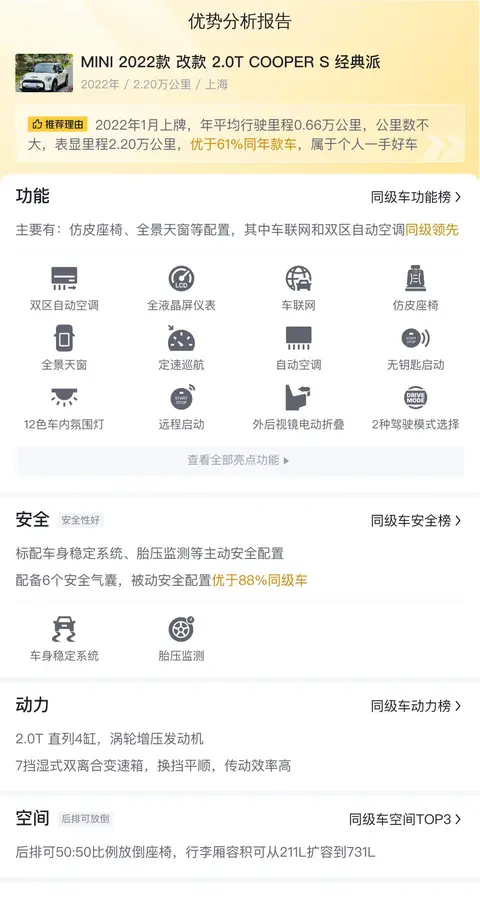接下来,我们来聊一聊这辆车的配置部分。其实对于一款主打个性化的小车来说,配置够用就好,关键还是要个性独特,与众不同。这辆二手MINI 2022款 改款 2.0T COOPER S 经典派配备了仿皮座椅、全景天窗等配置,其中车联网和双区自动空调更是同级领先。在动力方面,搭载2.0T直列4缸涡轮增压发动机,匹配7挡湿式双离合变速箱,换挡平顺,传动效率高。官方数据显示,百公里加速仅需6.7秒,综合油耗仅为6.1L(NEDC标准)。在空间部分,后排座椅可50:50比例放倒,行李厢容积可从211L扩容到731L,足以应对日常出行需求。