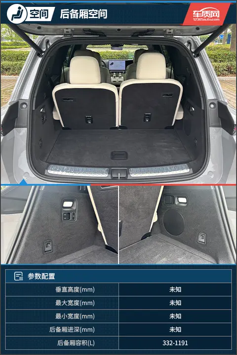 根据官方数据,评测车后备厢常规容积为332L,可扩展至1191L,具备较强的装载灵活性,能轻松应对日常所需。后备厢内部空间十分规整,左右两侧配有照明、锚点及挂钩等实用配置。第三排座椅支持电动放倒,且可通过调节车身高度,进一步提升取放物品的便利性,功能表现相当出色。