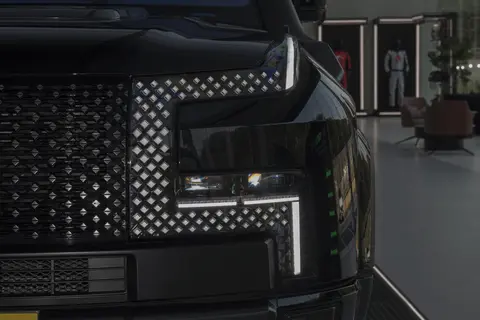 车身侧面,平直且富有张力的线条勾勒出硬朗的轮廓。整车长度(含备胎)为5319毫米,宽度达到2050毫米,高度1930毫米,配合3050毫米的轴距,使其在大型SUV阵营中也显得格外魁梧,视觉冲击力颇为显著。大尺寸的多幅条铝合金轮圈与厚实的轮眉相得益彰,强化了其稳固的姿态。隐藏式门把手的应用,不仅令侧面观感更为平整,也有助于优化空气动力学表现。D柱位置独特的能量塔设计,在车辆进行充放电或解锁时,能展现出个性化的灯光效果,增添了不少科技趣味。车尾造型相对简洁方正,外挂式备胎是硬派越野的经典元素,星际穿越尾灯与前灯组设计呼应,贯穿式灯带在夜间点亮后,无论在都市还是郊野,都有着清晰的识别特征。