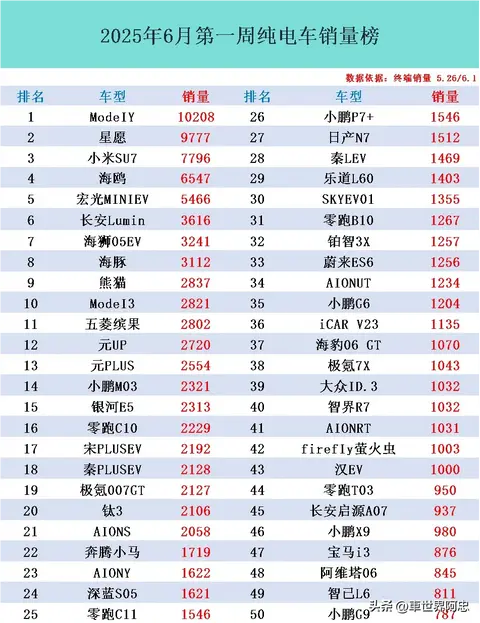 导读:如今的纯电车凭借经济环保等优势已经逐渐得到了国内众多消费者的认可了,不过纯电车也别乱买,参考销量排行十分关键!小编最新从终端销量获悉2025年6月第一周(5.26/6.1)纯电车销量排行榜已揭晓了!根据数据,纯电车市场竞争激烈,星愿不再是冠军,ModeIY重回巅峰,小米SU7荣升第三,海鸥以及宏光MINIEV排名都在比较靠前,另外、长安Lumin,海狮05EV,海豚,熊猫以及Model3销量都超过了2千辆,元PLUS,小鹏M03,零跑C10,宋PLUS和钛3表现也都十分出色!纯电车别瞎买!6月第1周销量揭晓:星愿丢冠,海狮05第7,钛3第20