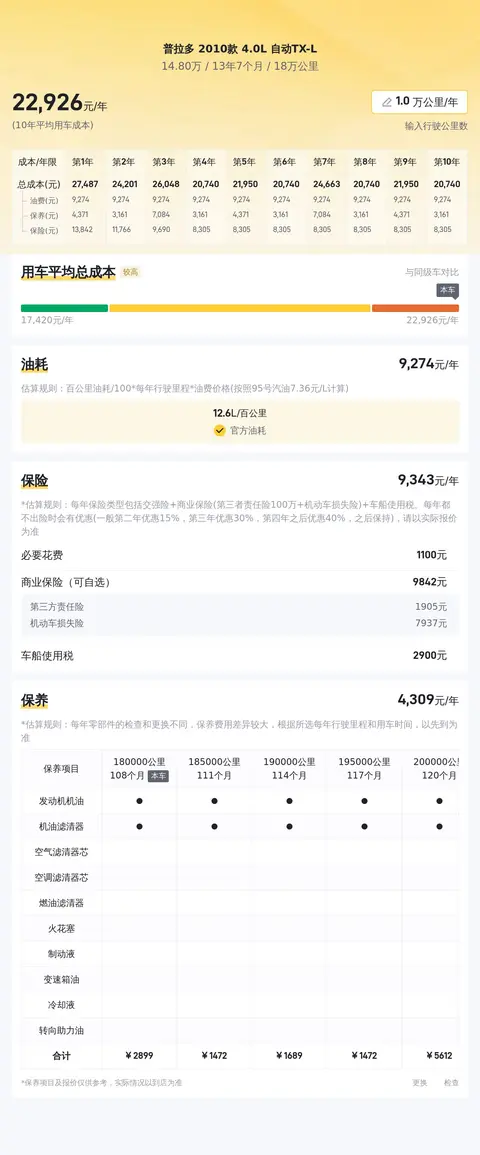 据估算,普拉多 2010款 4.0L 自动TX-L的用车成本较低,因为它的用车成本是22654元/年,同级车最低用车成本是21760元/年,最高用车成本是40715元/年。
