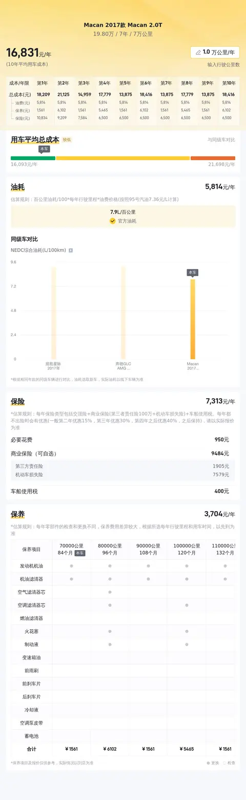 接下来,我们基于懂车帝的大数据分析来聊聊Macan 2017款 Macan 2.0T的市场行情和用车成本。目前,这款车型的二手车市场价位大致在19.03万至24.19万之间。当然,具体的售价会受到车辆状况等因素的影响。