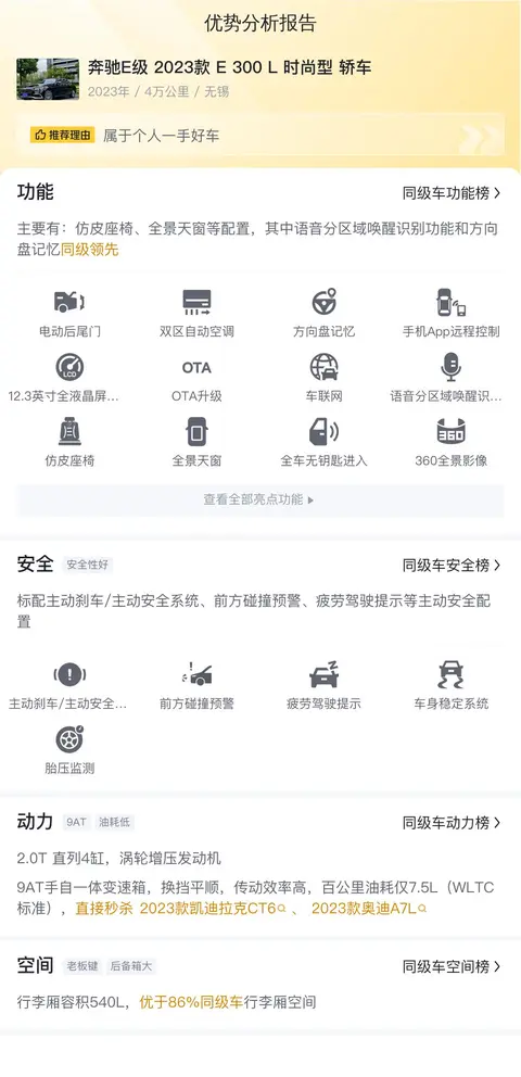 根据估算,这辆二手奔驰 E 级的年均综合用车成本约为 1.4 万元左右。这里值得一提的是,用车成本受多种因素影响,包括用车频率、油价波动、保险费用和保养支出等,因此实际成本可能会因个人用车习惯和市场情况而有所不同。