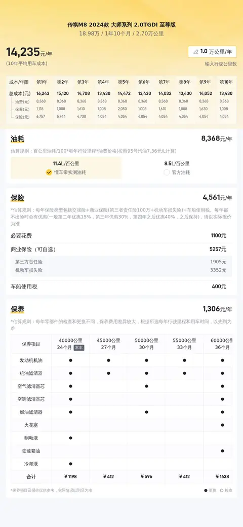 传祺M8 2024款 大师系列 2.0TGDI 至尊版搭载2.0T直列4缸,涡轮增压发动机,8AT自动变速箱,换挡平顺,传动效率高。百公里加速需10.2秒,适合追求平稳驾驶体验的用户。综合油耗(WLTC标准)约8.9L/百公里,碳排放量(WLTC标准)203g/km,符合国家标准。