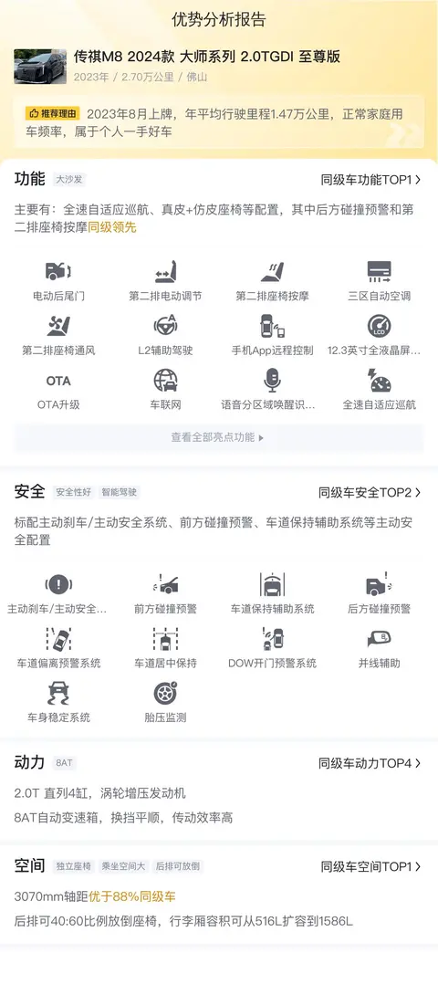 综合来看,传祺M8 2024款 大师系列 2.0TGDI 至尊版以其卓越的动力表现、宽敞舒适的乘坐空间、丰富的配置和出色的燃油经济性,成为了MPV市场中的佼佼者。无论是家庭用户还是商务人士,都能在这辆车中找到满足自己需求的点。如果您正在寻找一款既能满足日常出行需求,又能提升生活品质的MPV,那么这辆二手传祺M8无疑是一个值得考虑的选择。