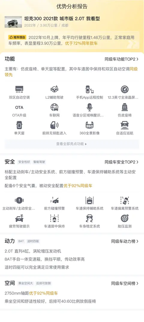 优势:坦克300的外观无可挑剔,整车看着非常的硬朗结实,非常具有辨识度,一直是众多越野车爱好者的心头好,车子使用时间不到三年,行驶里程也才3.9万公里,使用程度属于比较轻的,车子各方面的性能都保持的不错。价格方面16.58万的报价在当前市场行情下属于偏高的报价了,不过考虑到车子各方面保持的良好状态,也是情理之中。