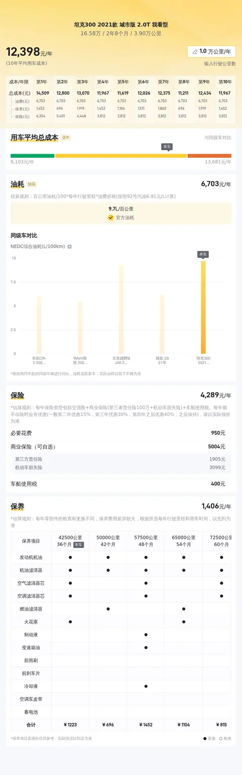 据估算,同级车的最低用车成本是5690元/年,最高是12245元/年,坦克300 2021款 城市版 2.0T 我看型是12245元/年,所以用车成本较高。