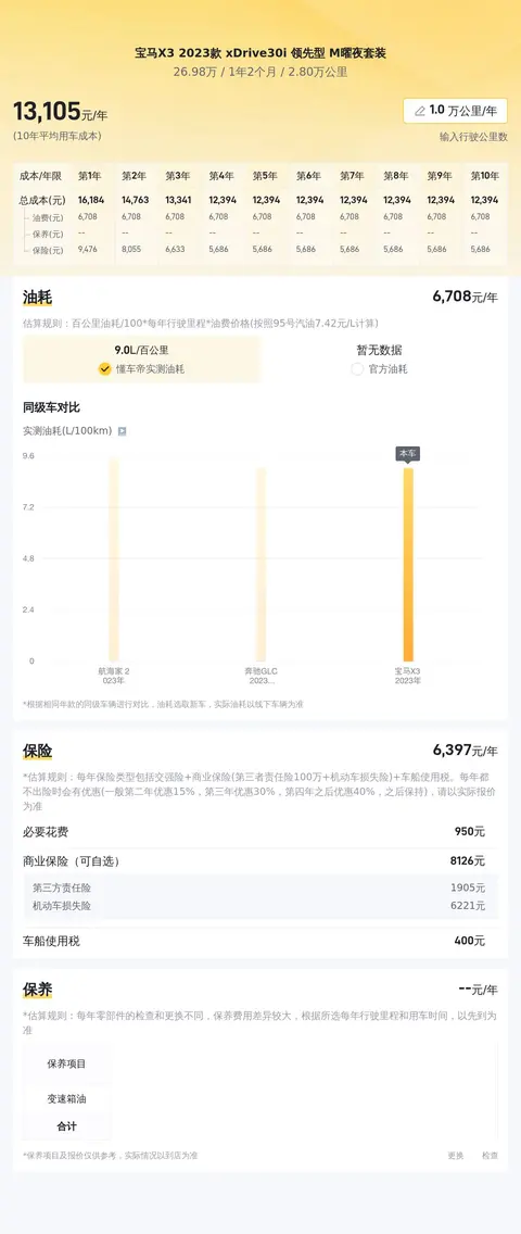 根据估算,这辆车的年均综合用车成本约1.3万元左右,这项花销是跟车主的实际用车场景和使用强度有直接变化的。