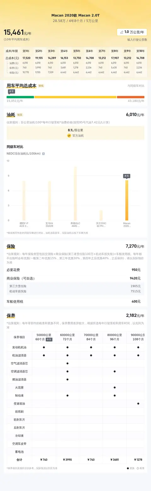 这辆Macan 2020款 Macan 2.0T,年均综合用车成本是15181元,这是在一个合理的区间范围内,毕竟这么大排量的发动机,需要多吃点“草”。