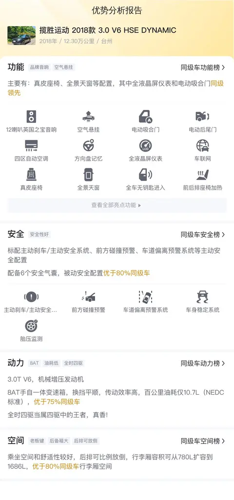 综上所述,2018款路虎揽胜运动版3.0 V6 HSE DYNAMIC是一款集豪华、性能和舒适于一体的高端SUV。它在设计、配置、动力和操控等方面都表现出色。如果你正在寻找一款既能满足日常驾驶需求又能展现个人品味的车型,那么这款车绝对是一个不错的选择。然而,作为一款高端车型,该车在保养和维修方面的成本也相对较高。在购买前,请充分考虑自己的经济能力和使用需求。同时,建议您在看车时仔细检查车况,确保没有遗漏的问题。希望这篇文章能为您提供有用的信息,帮助您做出明智的决策。