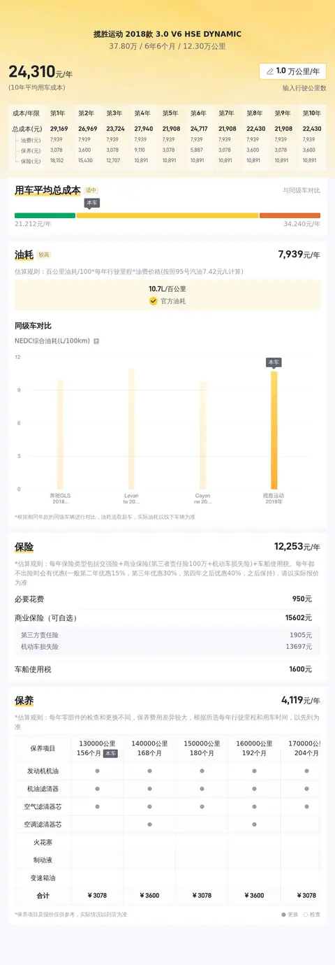 关于用车成本方面,根据大数据测算的结果显示,该款车的10年平均用车成本大约在23902元/年,这其中包括约10251元/年的油费、4709元/年的商业保险费以及5942元/年的保养费。值得一提的是,该款车的百公里油耗约为10.7升,对于一辆豪华SUV而言,这一油耗水平属于正常范畴之内。当然,具体的用车成本还会根据车主的实际使用情况和驾驶习惯有所变动。