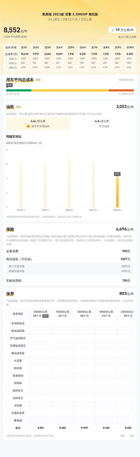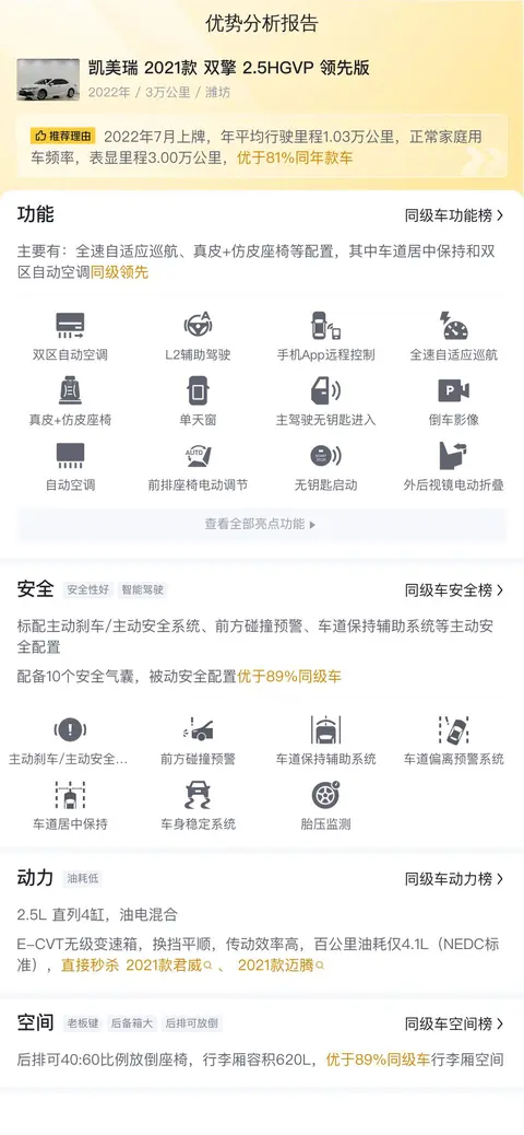据估算,同级车的最低用车成本是5278元/年,最高是12731元/年,凯美瑞 2021款 双擎 2.5HGVP 领先版是9077元/年,用车成本适中,不占优势。