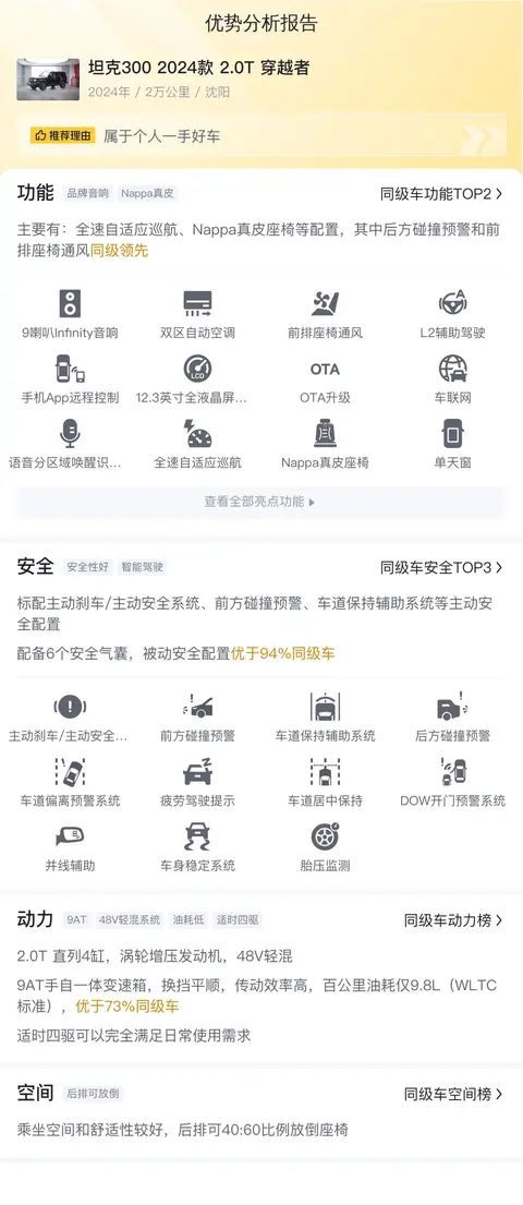 据估算,坦克300 2024款 2.0T 穿越者的用车成本是7458元/年,不算低,同级车最低是6606元/年,最高是11461元/年,所以它的用车成本正常。