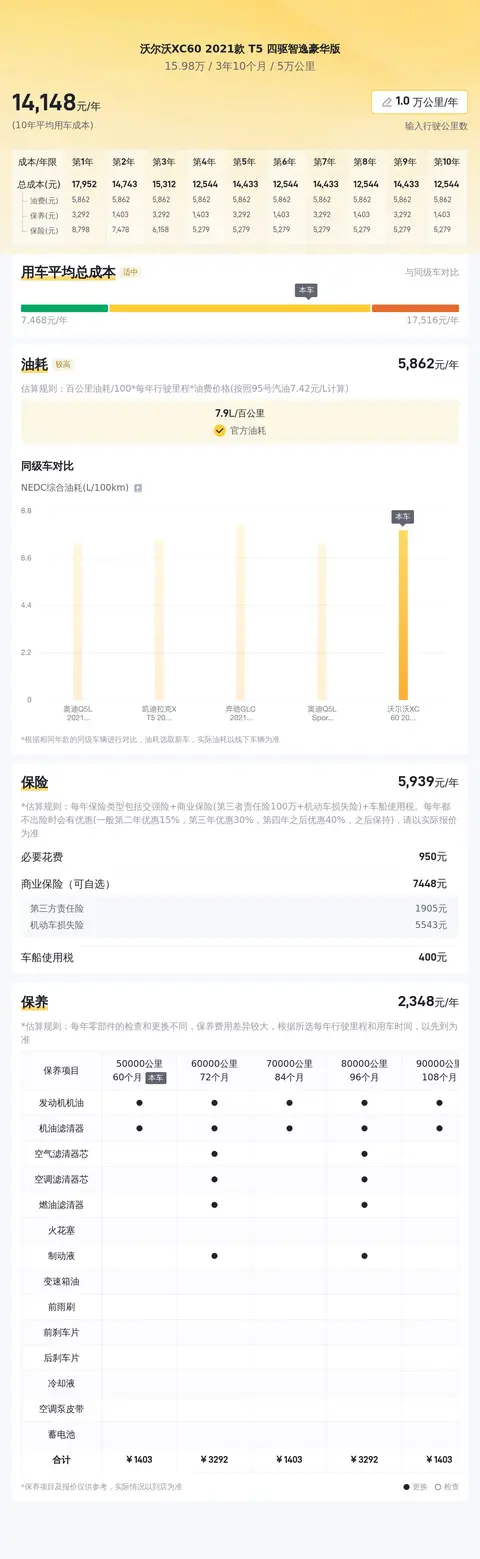 考虑到这台沃尔沃XC60 2021款 T5 四驱智逸豪华版只有4年的车龄、5万公里的里程以及0次过户,这些因素都指向了一个车况很可能良好的前提。结合懂车帝平台的数据,该车目前售价15.98万,预计再行驶2年后可卖12万,约折价19.0%,可以看出这台车在价格上是有优势的,且沃尔沃XC60 2021款 T5 四驱智逸豪华版在配置、动力、空间等方面均表现出色,是一款集豪华与实用于一体的优质豪华SUV。如果您正在寻找一款豪华SUV作为家庭出行的代步工具,那么这款二手沃尔沃XC60 2021款 T5 四驱智逸豪华版将是一个不错的选择。需要注意的是,本车没有检测报告,看车时需要向商家索取正规的第三方权威机构的全面完整的检测报告,以便您可以更全面、细致地了解这台车的车况。