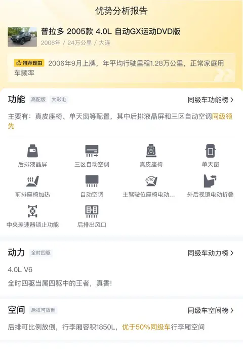 优势:皮实耐用,而且保值率高,有很好的保值能力,即使再开个三五年折损也不会太多。空间大,适合全家出行,越野能力强,可以适应各种路况。