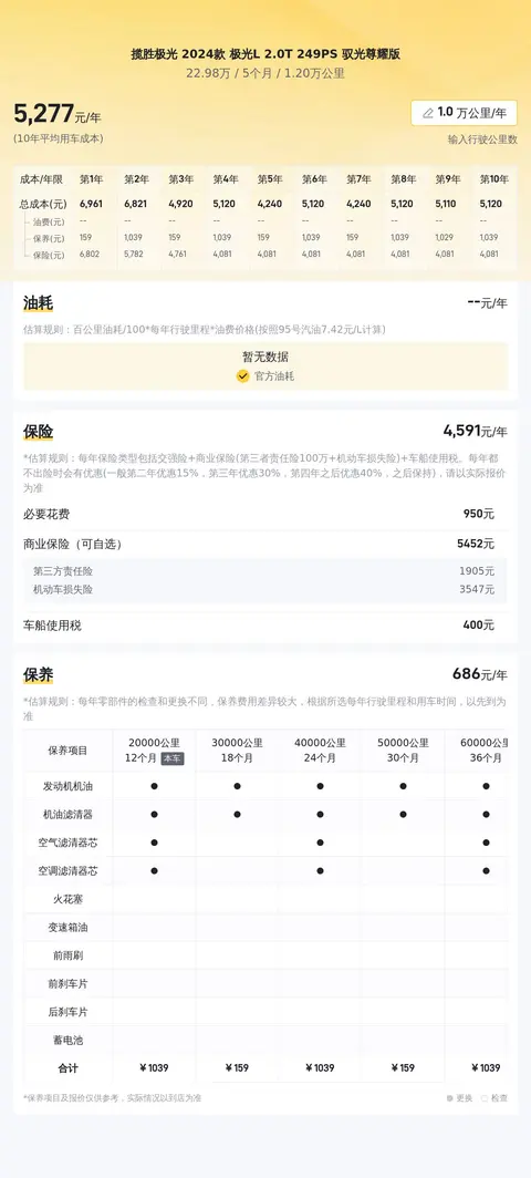 据估算,揽胜极光 2024款 极光L 2.0T 249PS 驭光尊耀版的用车成本是11792元/年,毕竟同级车最低是11792元/年,最高是21866元/年,所以它的用车成本较低。