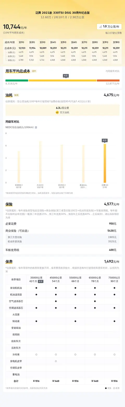 据估算,同级车的最低用车成本是6506元/年,最高是13786元/年,迈腾 2021款 330TSI DSG 30周年纪念版是11338元/年,所以用车成本适中。