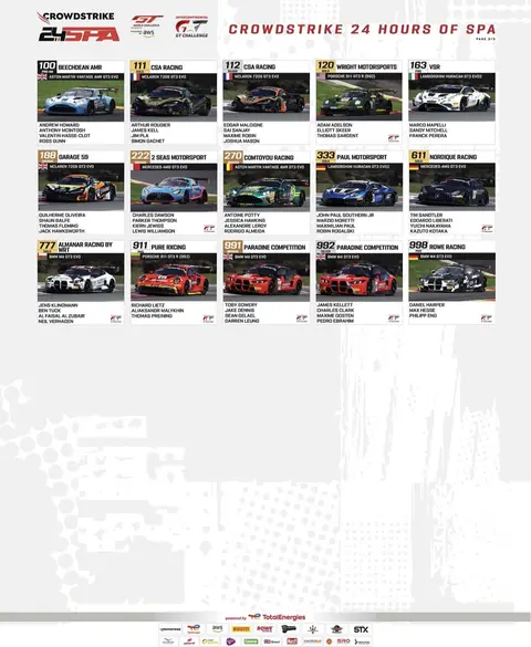 本届赛事吸引了来自全球的76辆赛车参赛,代表着世界级制造商和精英GT车队,参赛品牌涵盖法拉利、宝马、兰博基尼、迈凯伦、奥迪、梅赛德斯-AMG、保时捷、科尔维特、阿斯顿・马丁,以及由HRT Ford Performance倾力打造的福特野马GT3等。