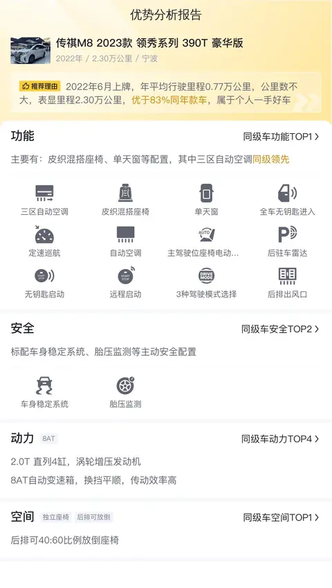 优势:作为一款自主品牌MPV,传祺M8经过几年的市场验证,得到了不少用户的认可,拥有一定的知名度和口碑基础,市场保有量也相当可观。这款传祺M8 2023款 领秀系列 390T 豪华版首次上牌2022年6月,累计行驶了2.3万公里,基本就是准新车,状态很好。空间宽敞,配置丰富,尤其是舒适性配置,非常到位。价格实惠,新车含税价为19.58万,现在的二手车报价是11.80万,相当于开2年多便宜了7.78万,很划算。