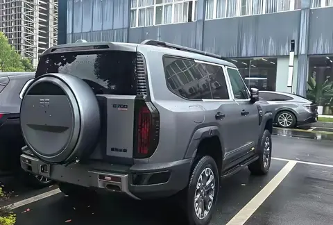 车长5米多,看着挺魁梧。前后保险杠都带护板,轮胎是AT胎,侧面能看见备胎挂在车尾。车门把手是老式的按压类型,后门能直接从外面拉开。这车不光看起来越野,底盘也是非承载式的,就是那种车架和车身分开的设计,和城市SUV不太一样。
