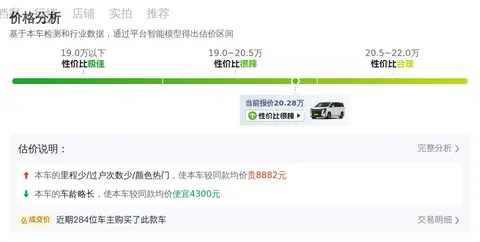 目前,这辆传祺M8 2023款 宗师系列 2.0TGDI 至尊版售价为20.28万,在二手车市场中,它的价格相对较高。根据市场评估,这可能与车辆的里程数较少有关。里程,少于均值1.8万公里,+7600元,车龄,多于均值0.5年,-4300元,过户次数,少于均值0.3次,+1200元,颜色,黑色,+82元。