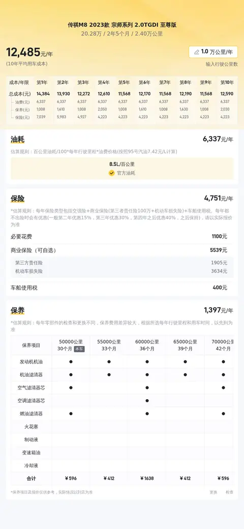 另外,根据估算,这辆传祺M8 2023款 宗师系列 2.0TGDI 至尊版,10年平均用车成本约为12477元/年。