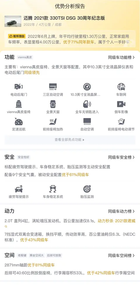 据估算,同级车的最低用车成本是6506元/年,最高是13783元/年,迈腾 2021款 330TSI DSG 30周年纪念版是11354元/年,所以用车成本适中。