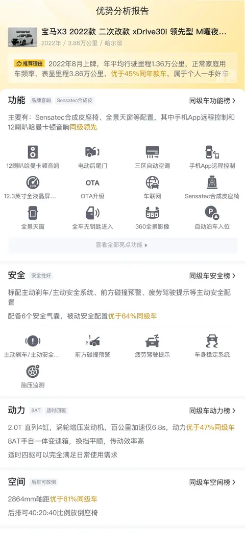 今天我们要为您介绍的这款二手宝马X3 2022款二次改款 xDrive30i 领先型 M曜夜套装来自哈尔滨,上牌日期2022年8月,表显里程3.86万公里,新车指导价44.19万,二手车报价28.7万,过户次数0次。该车配备有全景天窗、电动后尾门、感应式后尾门、无钥匙进入、手机无线充电等配置,其中手机App远程控制和12喇叭哈曼卡顿音响同级领先。动力方面,该车搭载2.0T 直列4缸,涡轮增压发动机,百公里加速仅6.8s,动力优于47%同级车。此外,该车还配备了8AT手自一体变速箱和适时四驱系统,可以完全满足日常使用需求。总体来说,这款二手宝马X3在车况、配置和性能等方面都表现出色,是一辆值得考虑的豪华SUV。