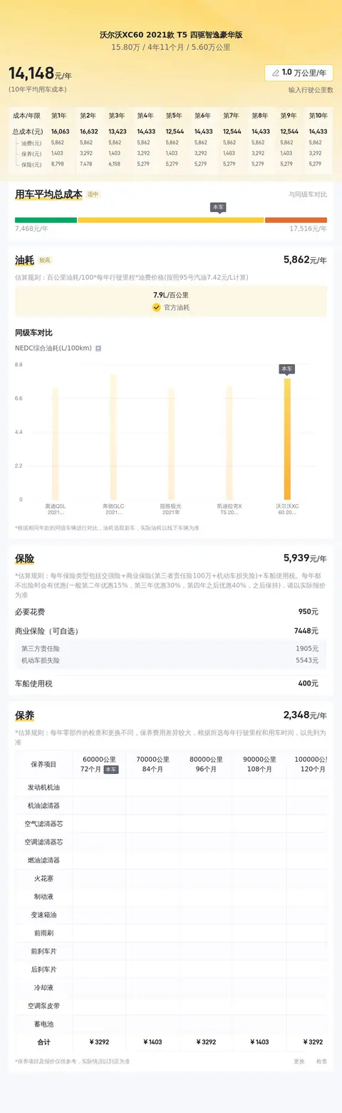 当前市场上,这款车型的二手车价格大约在 16.2万到20.22 万元之间。当然,具体的售价会受到车辆状况等因素的影响。关于用车成本方面,根据估算,这辆沃尔沃 XC60 2021款 T5 四驱智逸豪华版的年均综合用车成本约为每年 1.4 万元左右。这项信息可以帮助您更好地规划和预算日常使用支出。